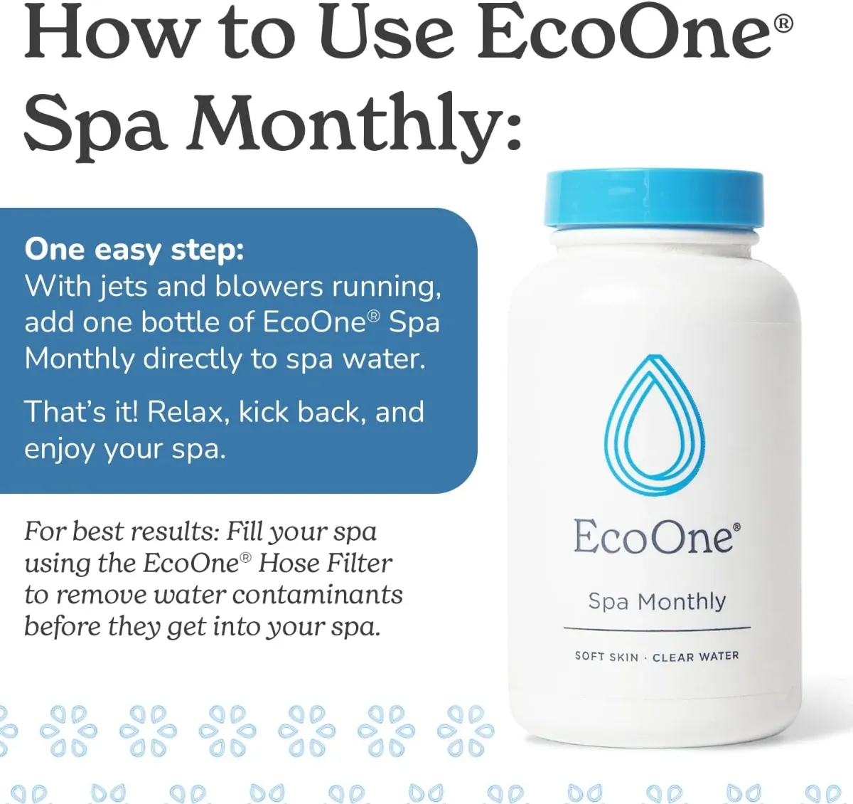 EcoOne Spa Monthly is the best and easiest way to maintain your spa Period. Get soft, balanced and clear water with every drop.
